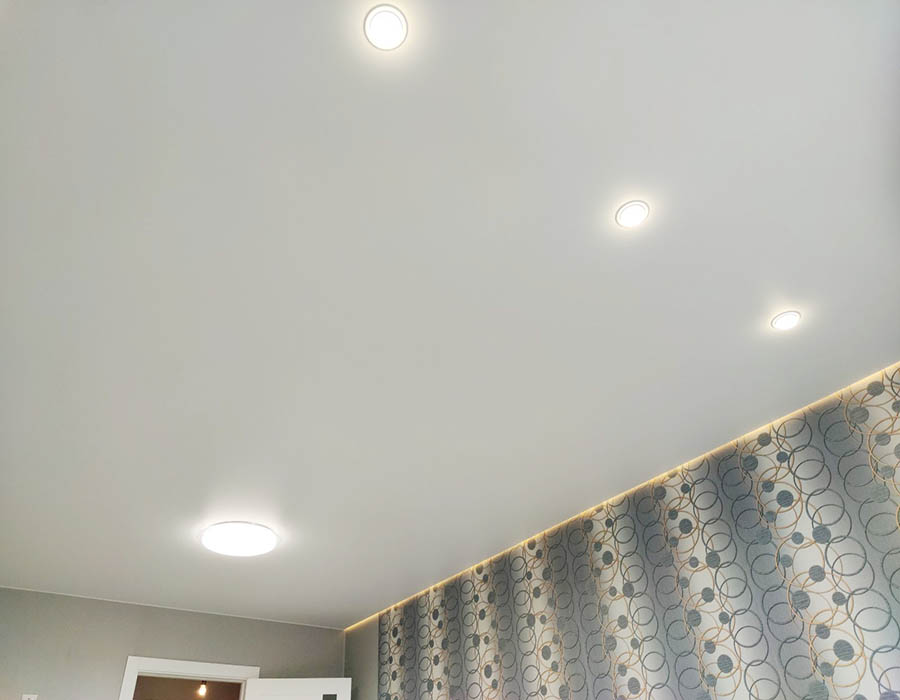 В итоге вы получаете красивые потолки. Производится окончательный расчет. Предоставляется гарантия 15 лет на полотно.